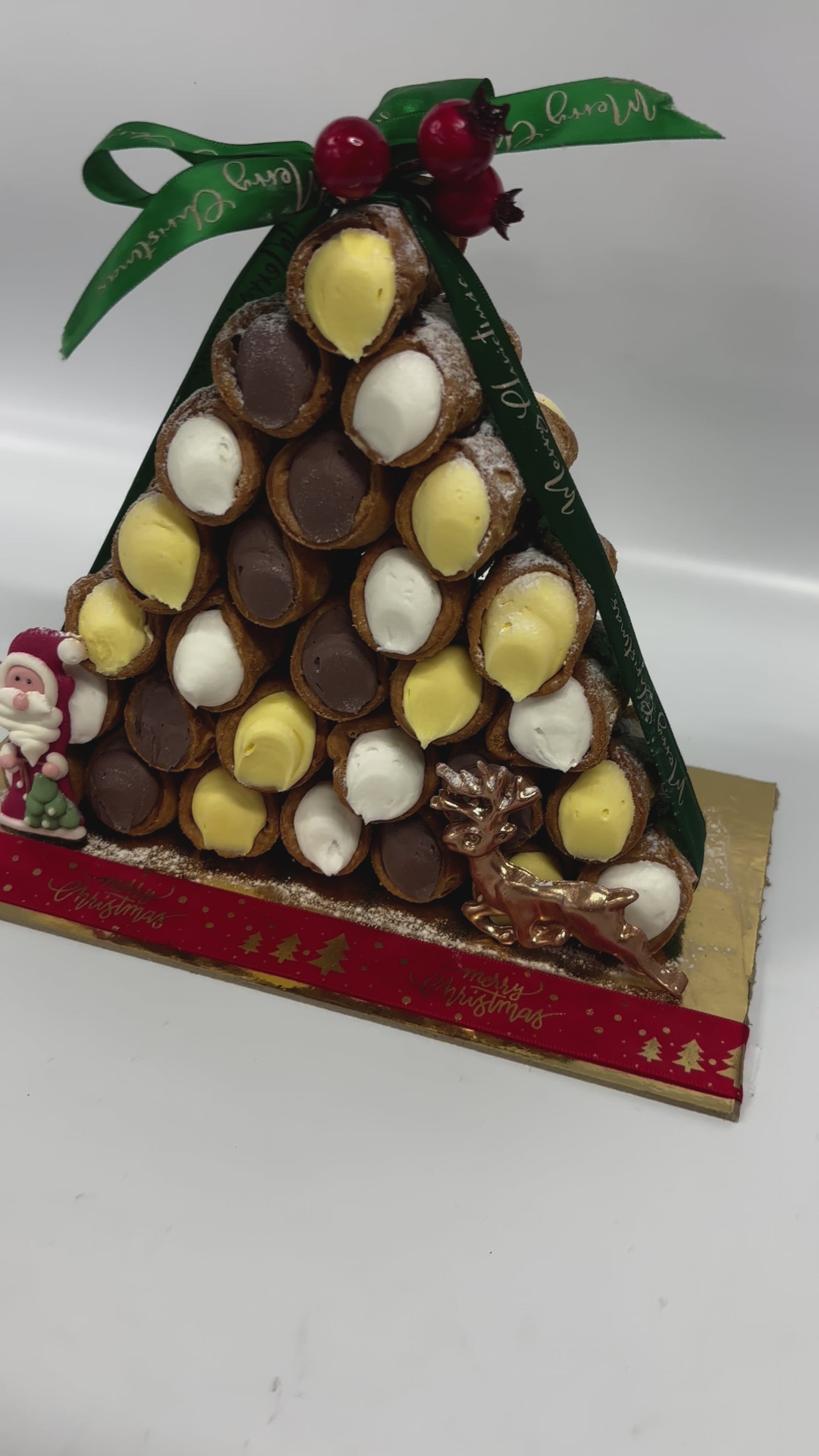 28 mini cannoli decorated in a tower with Christmas decorations.